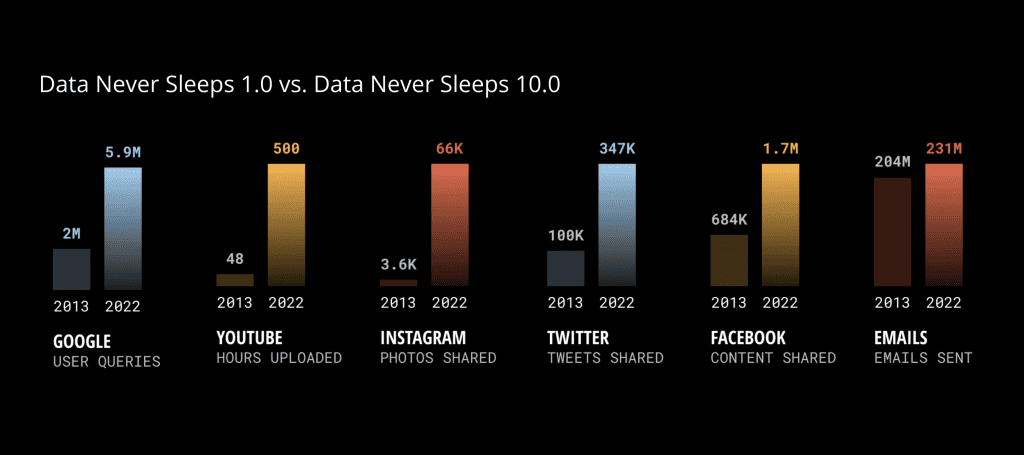 Un’infografica interessante che quantifica la mole di dati generati ogni minuto nel web. Quest’anno il report propone anche un confronto tra 2013 e 2022.